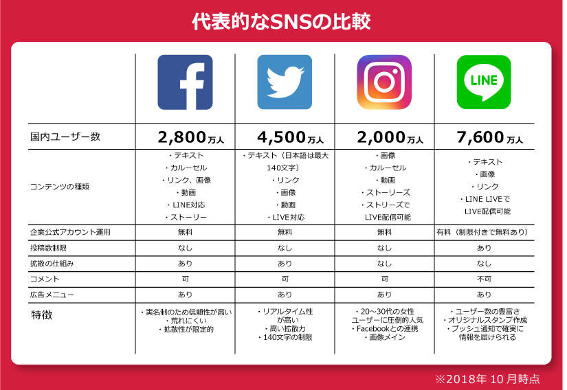 | 幅広い年齢層に利用され、コミュニティ形成に適している。 | 詳細なターゲティング広告や、企業の信頼性向上に役立つ情報発信に活用。 | |