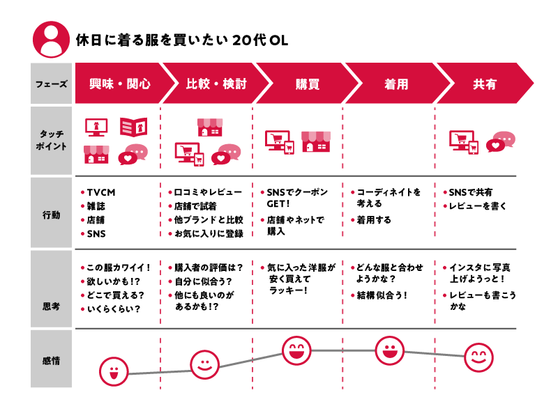 各フェーズで顧客がどのような行動をとり、何を考え、どんな感情を抱くかを具体的に記述します。 -